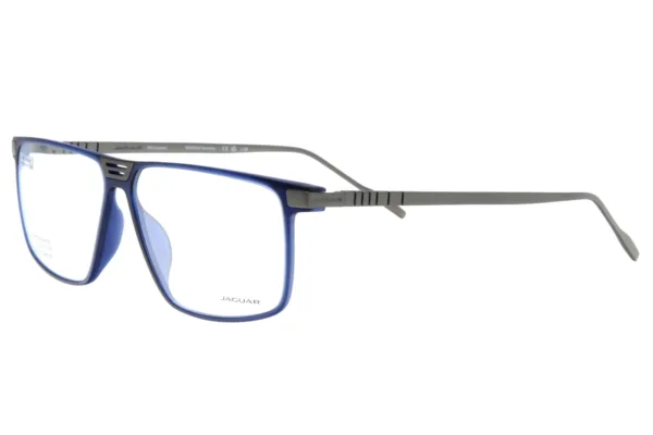Front w kolorze metalicznego granatu z charakterystycznym mostkiem o motoryzacyjnym sznycie podkreśla dynamiczny charakter marki Jaguar. Smukłe tytanowe zauszniki gwarantują niezwykłą lekkość, elastyczność i trwałość, dzięki czemu oprawki zapewniają wyjątkowy komfort przez cały dzień.